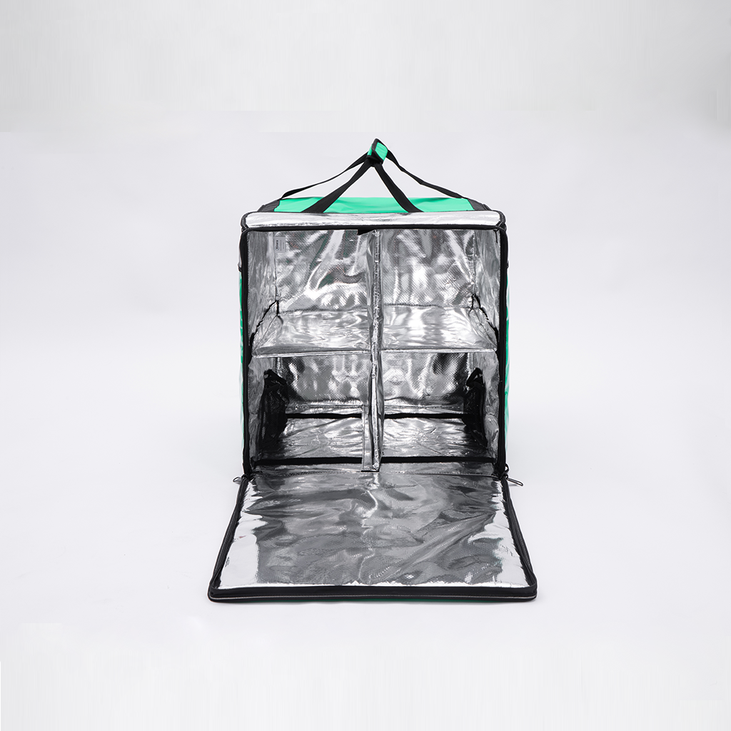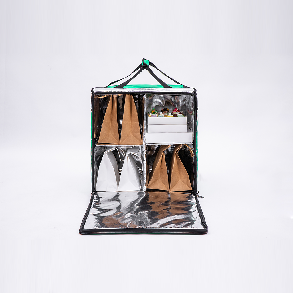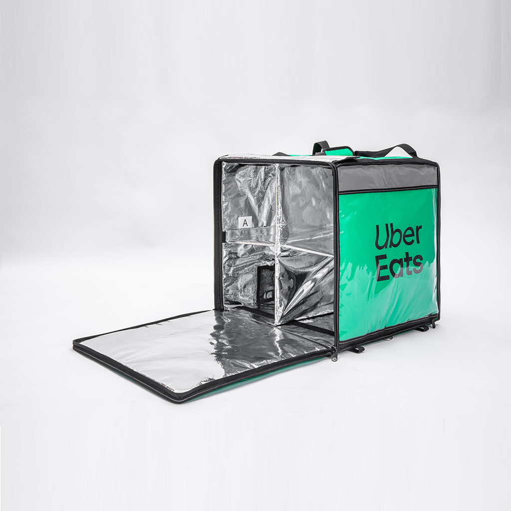 Uber Eats 品牌綠色 CPP 外送袋,配有反光條及透明展示窗,可放置宣傳資料。設計小巧實用,適合一般外送訂單,同時保持專業形象。