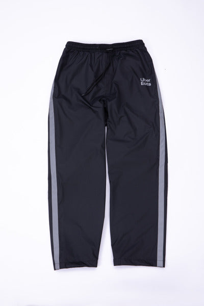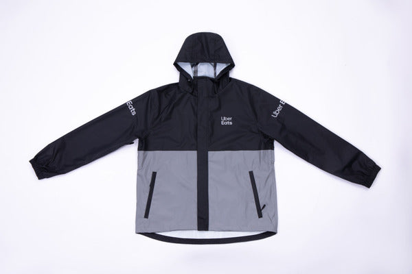 Uber Eats 品牌黑色二件式雨衣套裝,含雨衣與雨褲,配有反光片。全防水設計,確保外送夥伴在雨天保持乾爽與可見性,同時維持專業形象。