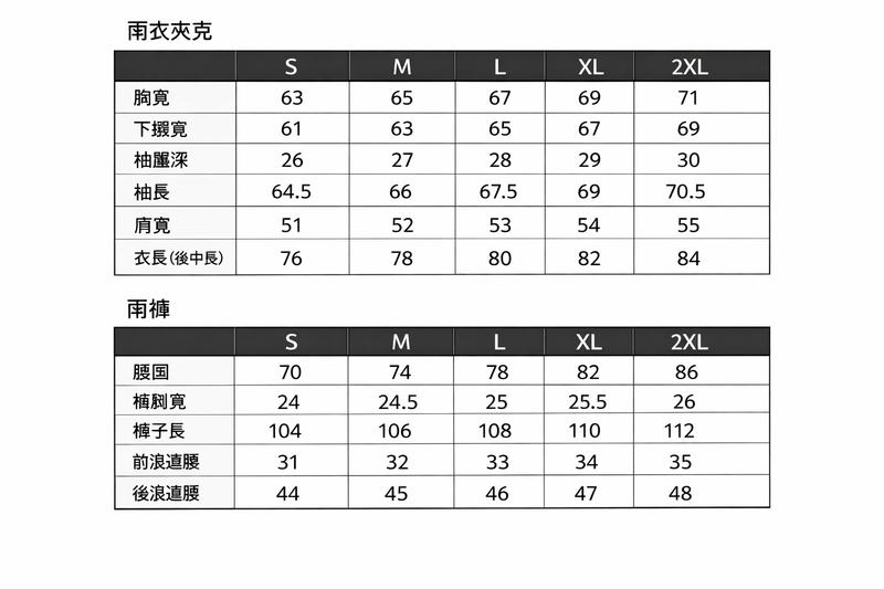• 二件式套裝(雨衣 + 雨褲)